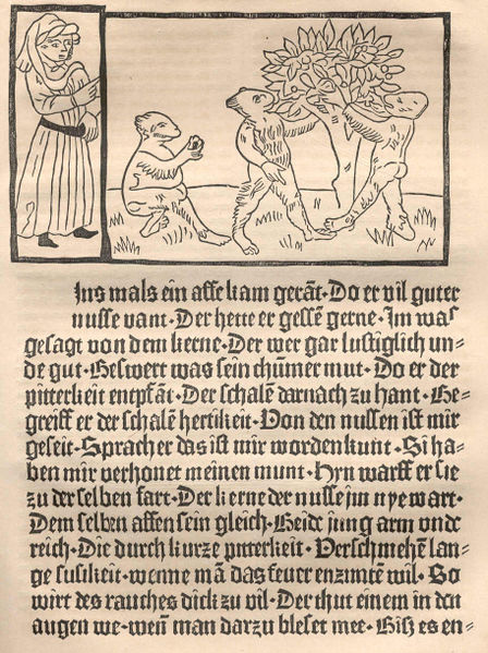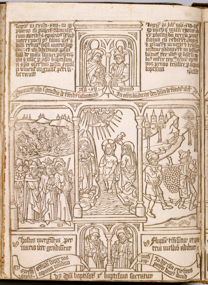 Block Books Mid 15th Century In the mid 1400's printing entire pages from carved wood blocks remained in practice, probably due to their economy over metal type press books. Most block books are primarily image, but the example above is an exception. It is a page from a Latin grammar of Donatus, a school text. More commonly block books were densely illustrated picture Bibles used by clergy for teaching, ie. the Biblia Pauperum, or Poor Man's Bible. Some text was included in conversation bubbles shaped like ribbon strips—much like today's graphic novels use speech balloons.