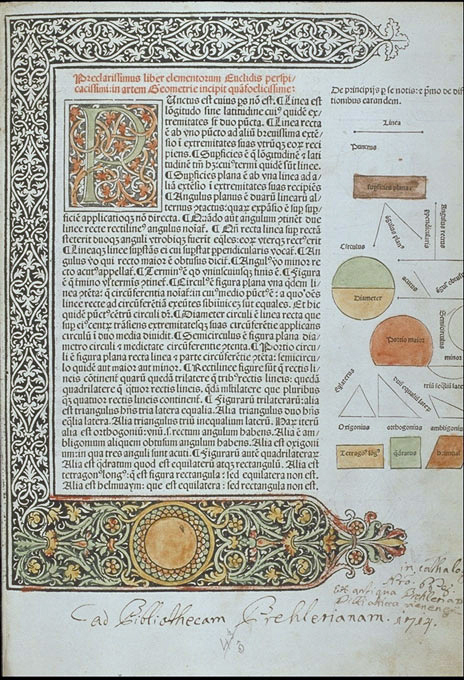 Printed Decoration via Carved Woodblocks In 1461 Albrecht Pfister printed Edelstein, the first book with woodcut illustration which replaced the time-consuming art of hand illumination. See it here. Above is a page design by Erhard Ratdolt, a printer known for his elaborate borders and large ornate initial caps reflecting eastern Arabic influences. His fame rests largely on the 1482 first edition of Euclid's Elements: its illustration of over 420 perfect geometrical figures. A link to Ratdolt's design of a page on mathematics. Ratdolt produced a type specimen sheet to display his house typefaces; a decorated initial, ten sizes of rotunda faces, three sizes of roman, and one of greek. |