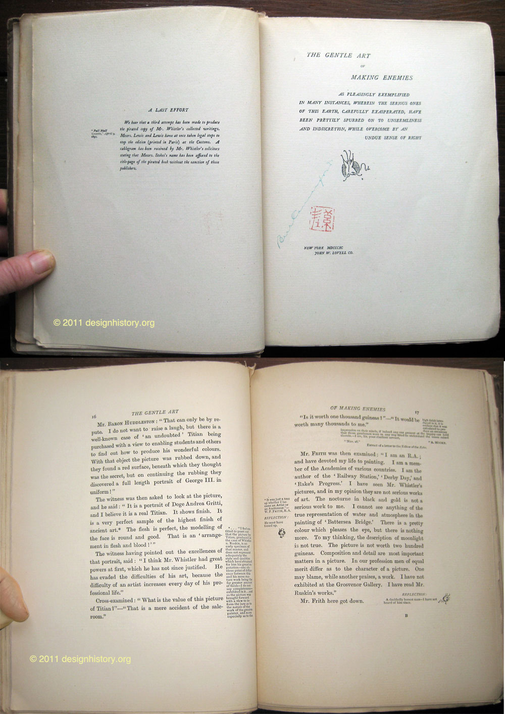 In his, The Gentle Art of Making Enemies, 1890, (above) James Whistler (1834-1903) worked in double page spreads, carefully considering the use of white space against the text and ornaments. Whistler harkened back to early manuscripts with his use of gloss comments in the generous manuscript-like borders. In this case the device of gloss was used for Whistler to comments alongside the discussion of his famous lawsuit against the influential art critic John Ruskin.