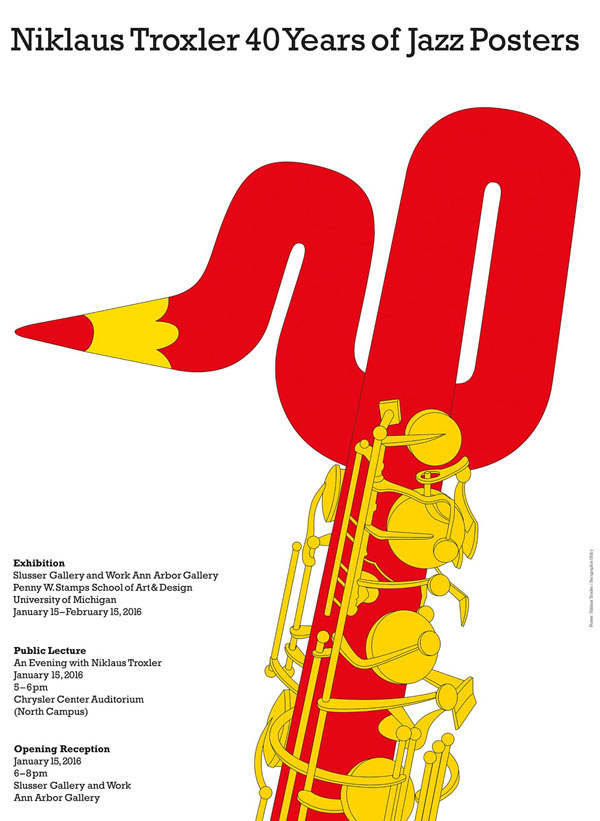Niklaus Troxler: 40 Years of Jazz PostersUniversity of Michigan January 15-February 20, 2016 Curated by Stamps Professor Franc Nunoo-Quarcoo and Stamps student Cody Cai (BA 17),Niklaus Troxler: 40 Years of Jazz Posters explores work by designer Niklaus Troxler, a Swiss-born professor and design consultant widely known for his founding of the annual Willisau Jazz Festival in 1975. His pioneering design pieces for Willisau Jazz Festival have been benchmarks in the field of graphic and poster design for about forty-five years and are now in important museum collections such as the Museum of Modern Art New York, the Museum of Modern Art Toyama, Museum for Art and Industry Hamburg, the German Poster Museum in Essen and the Stedelijk Museum in Amsterdam. |