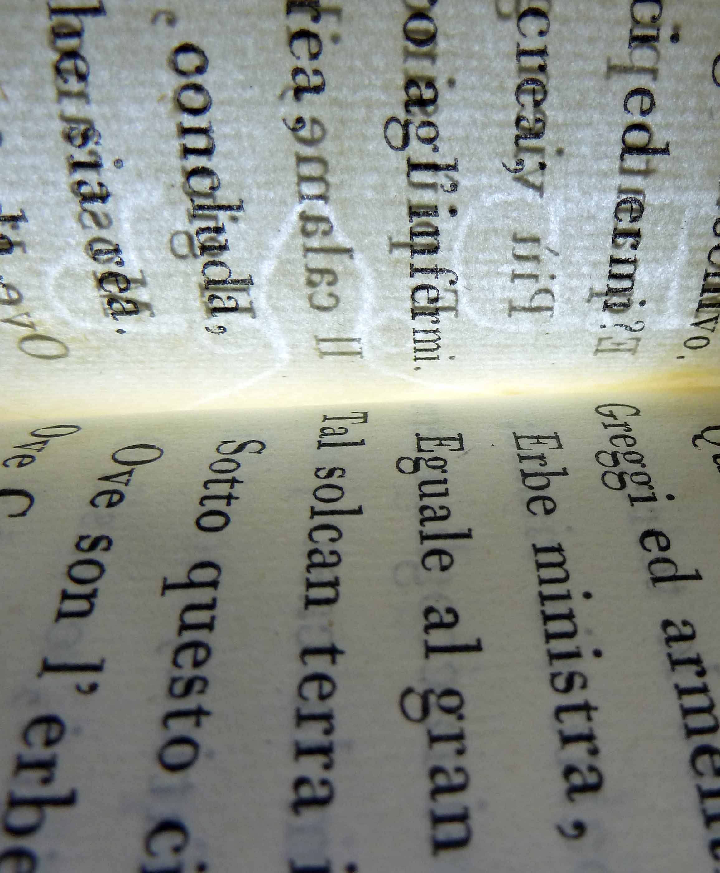 Watermarks are decorative images embedded into the fibers of paper during the production process. The image can be a simple outline, text or elaborate images with gradient tones. Shown above: Watermark for Fabriano, the oldest paper factory in Europe. Below the watermark as it appear in Bodoni's Il Podere, 1797. See it larger here. ![]() |
