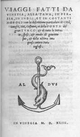 Printer's Devices An often duplicated printer's mark of the anchor and dolphin (reflecting the motto, Make Haste Slowly) originated with the master printer Aldus Manutius, who started his famous Aldine Press in Venice in 1494. The Aldine innovations included scholarly editing of content, high quality typography and printing as well as masterful woodcut illustrations. Look for more about him in the section on this site, A History of Books. |